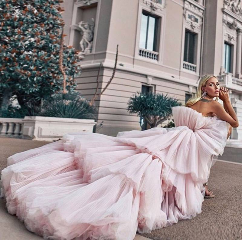 Robe de mariée rose asymétrique couture avec cascade de tulle à Marseille 13001
