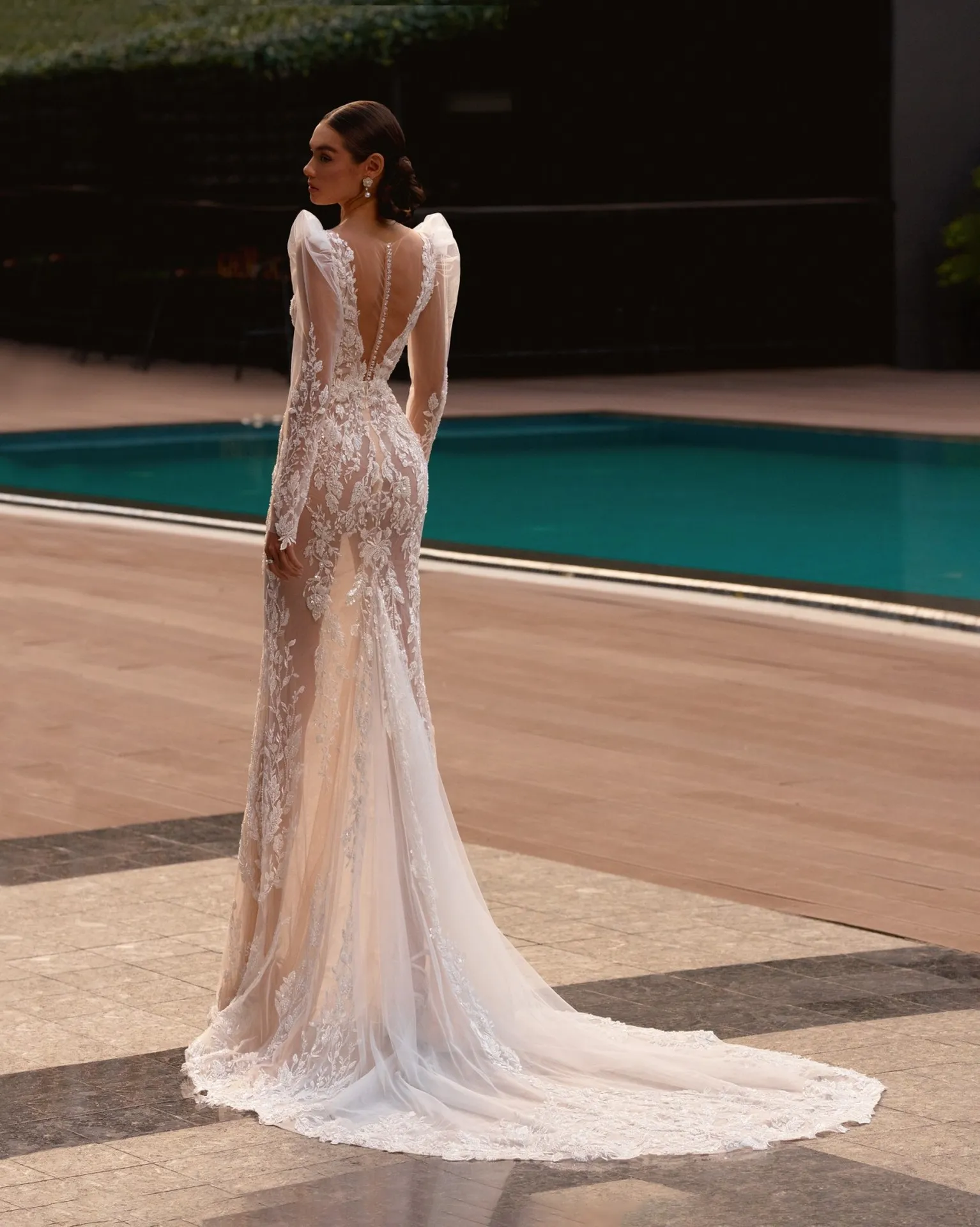 tulle brodé de dentelle perlée et se termine par une longue traine cathédrale qui donne à la robe de mariée sirène son allure majestueuse