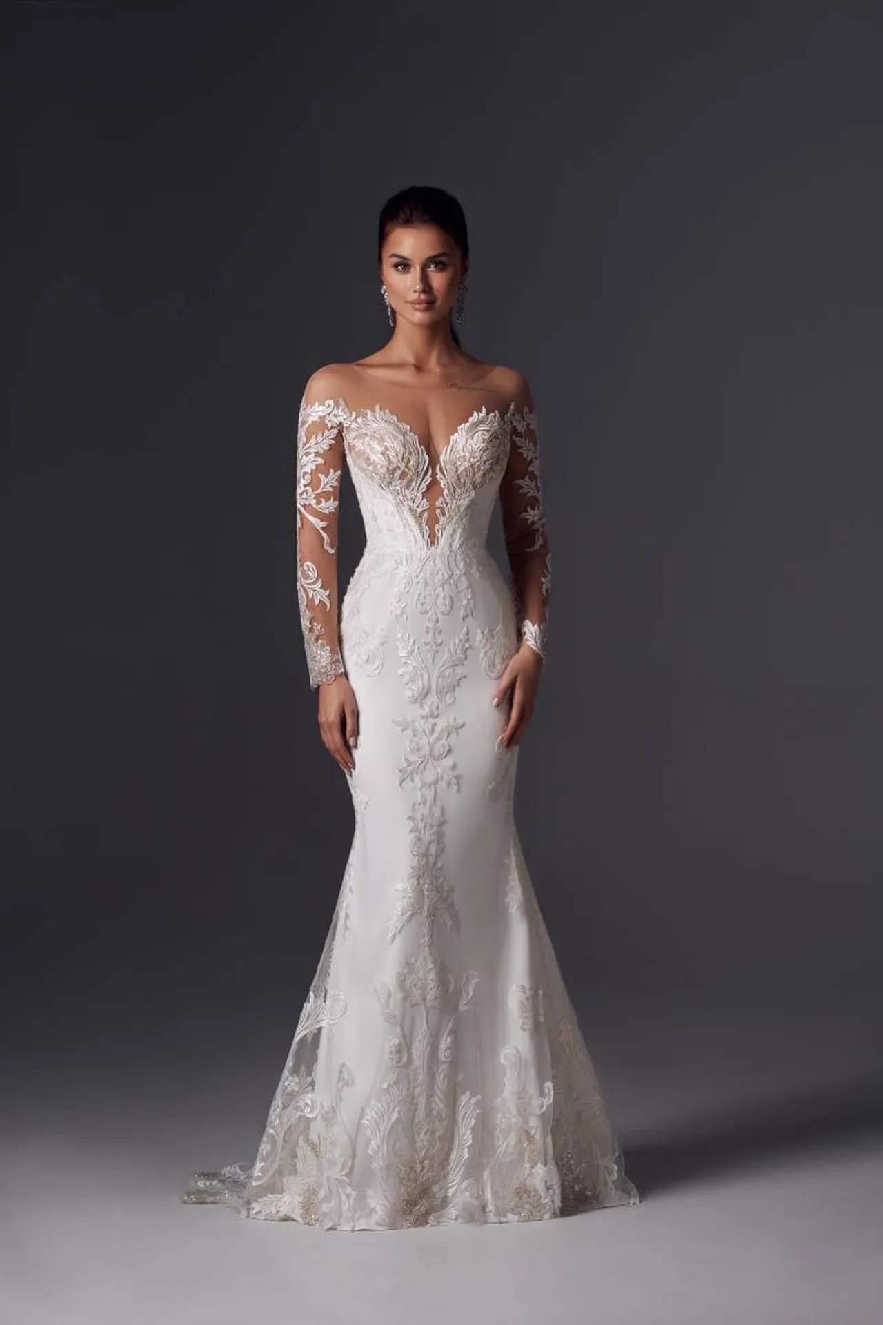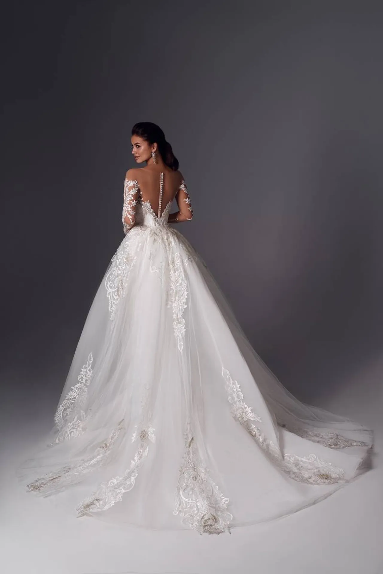 La robe de mariée Ashanti présente un bustier à décolleté plongeant, recouvert d’un fin tulle couleur chair qui confère un effet seconde peau, subtil et sophistiqué. Les manches longues, effet tatouage, sont richement ornées d’applications de dentelle qui se fondent délicatement sur la peau. La finition bijoux au bas des manches ajoute une touche glamour, pour un look à la fois chic et tendance.