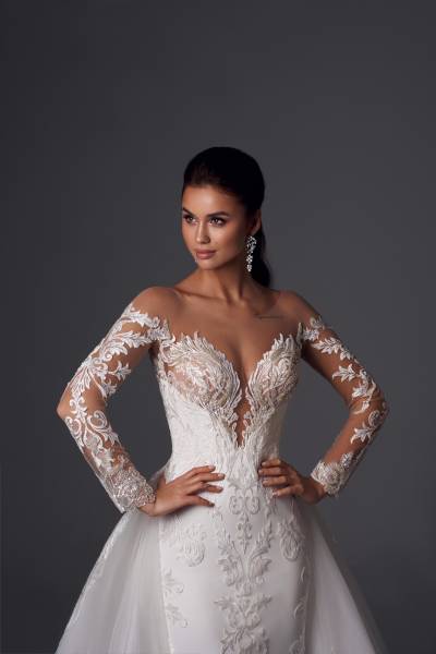 La robe de mariée Ashanti présente un bustier à décolleté plongeant, recouvert d’un fin tulle couleur chair qui confère un effet seconde peau, subtil et sophistiqué. Les manches longues, effet tatouage, sont richement ornées d’applications de dentelle qui se fondent délicatement sur la peau. La finition bijoux au bas des manches ajoute une touche glamour, pour un look à la fois chic et tendance.