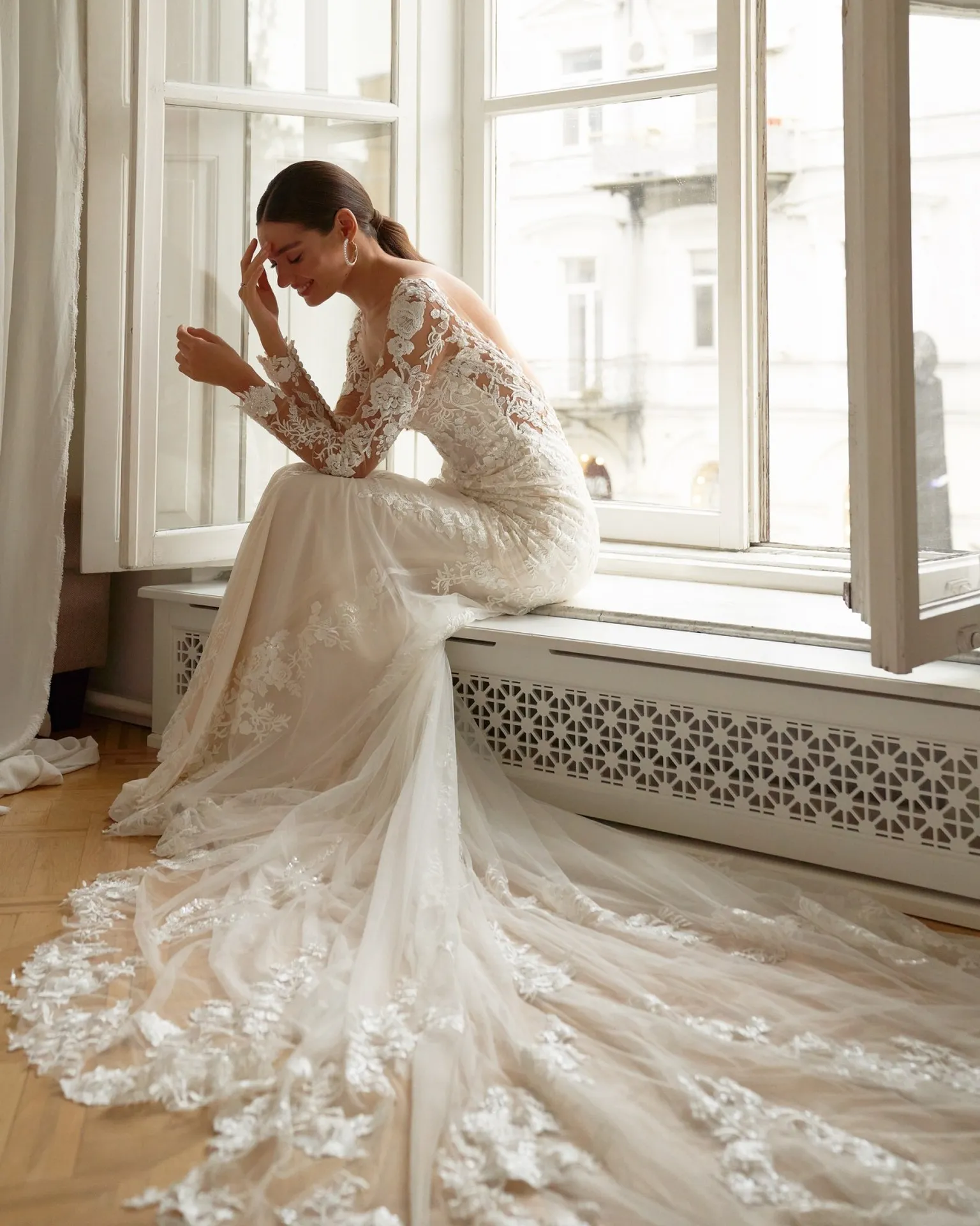La robe de mariée BITAN se distingue par son bustier en forme de V plongeant, subtilement orné de dentelle à motifs floraux et de perles délicates, qui ajoutent une touche de raffinement et de charme. Les manches longues en dentelle créent un effet tatouage sophistiqué sur les bras, apportant à la fois modernité et élégance. Cette dentelle fine et transparente confère à la robe une allure sensuelle tout en restant raffinée, idéale pour une cérémonie chic et contemporaine.