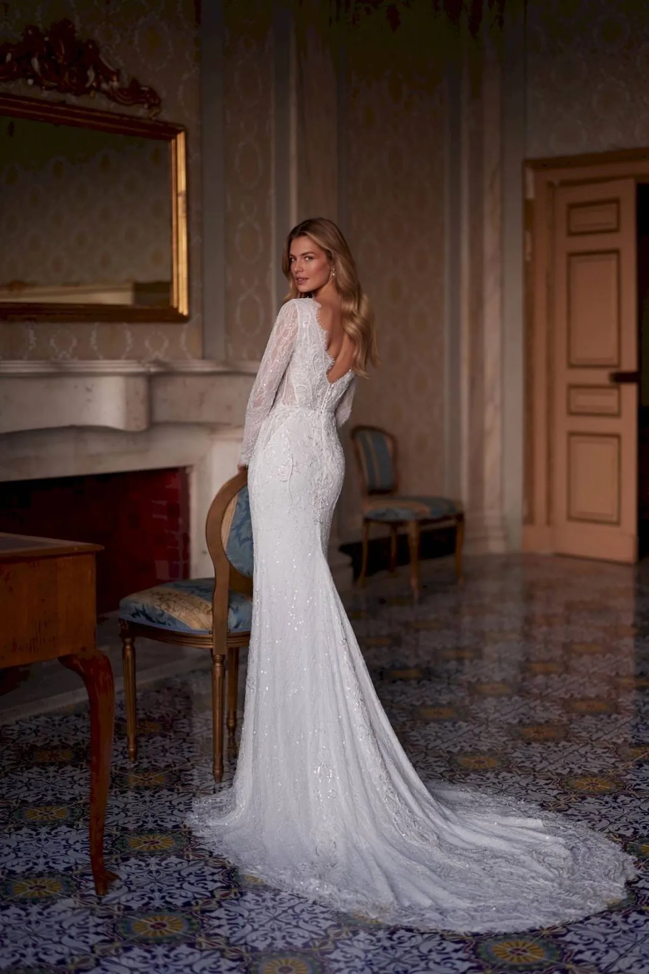 Robe de mariée sirène marseille avec manche longue et buste tatouage de dentelles