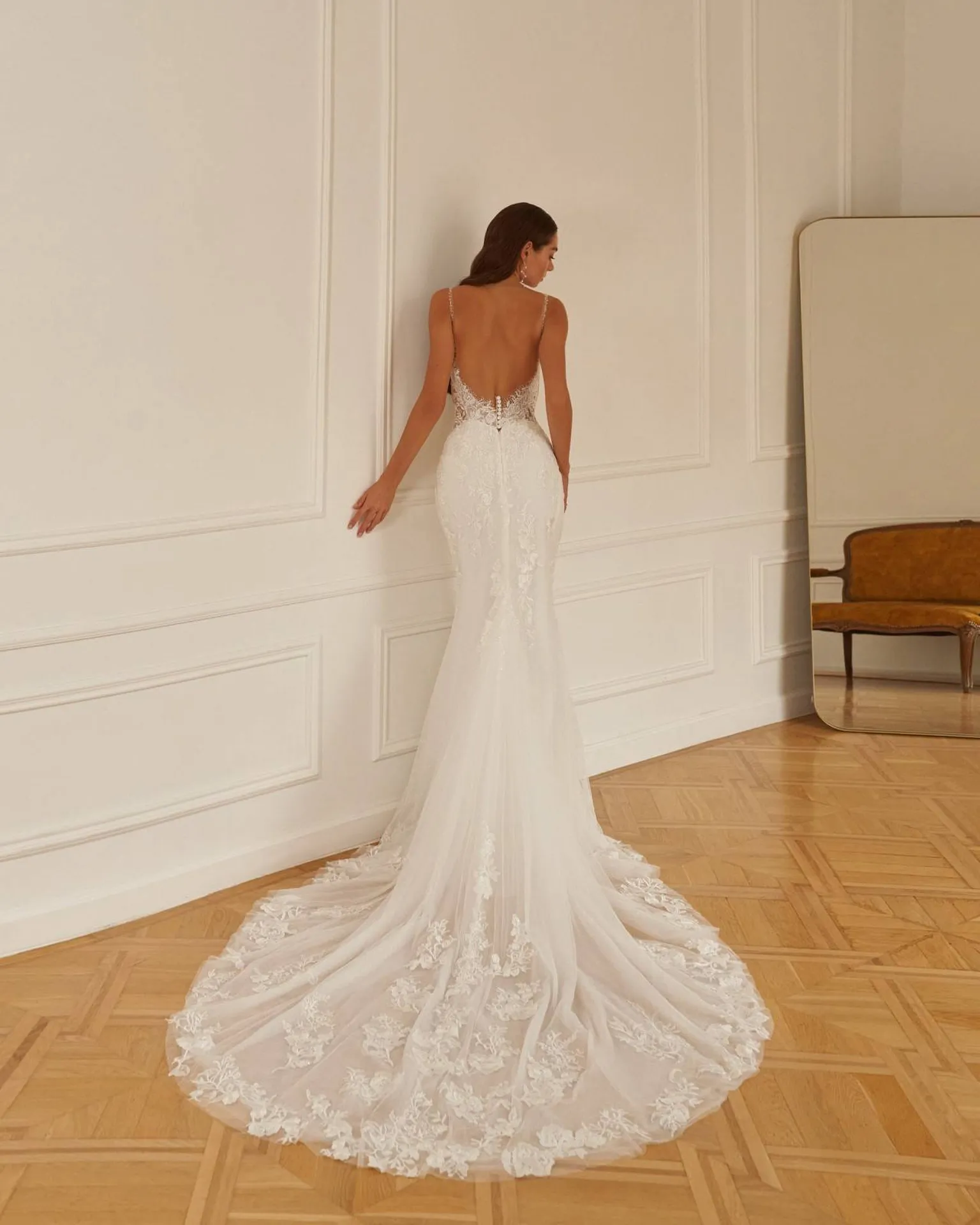 Robe de mariée sirène décolleté plongeant avec longue traîne brodée de dentelle à Marseille