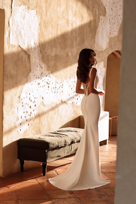 Avec ses larges bretelles, la robe de mariée Hilga met en valeur la silhouette de manière naturelle et souligne délicatement les épaules. Sa coupe ajustée en fait un modèle qui flatte particulièrement les formes tout en restant subtilement séduisant. Le tissu lisse en crêpe, sans ornements superflus, met l'accent sur la simplicité tout en ajoutant une touche sophistiquée à l’ensemble. Ce modèle offre un décolleté en V plongeant, qui allonge la ligne du cou et ajoute une pointe de sensualité, idéale pour les mariées qui souhaitent un look à la fois sobre et audacieux.