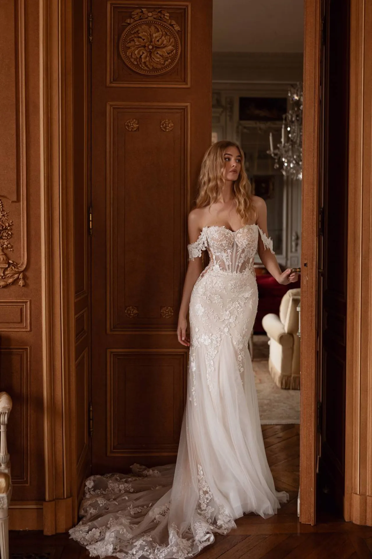 cette robe de mariée à la coupe sirène est au décolleté bateau à la particularité d’être brodée de plumes d'autruche et de cygne véritable avec une traîne fluide