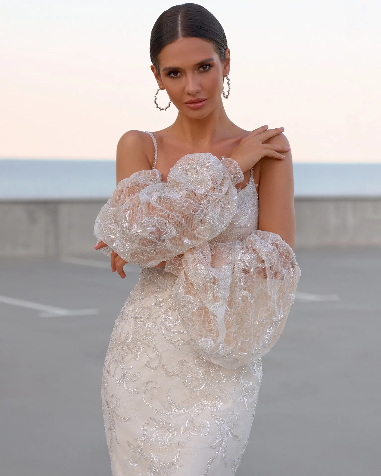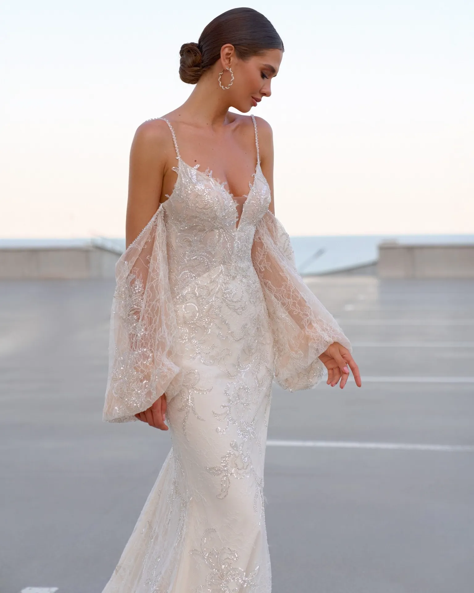 Le haut de la robe de mariée WITNEY présente un magnifique décolleté plongeant en V, délicatement orné de dentelle raffinée et de petites perles scintillantes. Ce détail apporte une touche de féminité et de sophistication, idéale pour un mariage chic et moderne. Les bretelles fines et perlées ajoutent de la légèreté à l’ensemble. De plus, pour les mariées en quête de polyvalence, la robe propose des manches amovibles en dentelle, brodées de motifs floraux et rehaussées de perles, qui permettent de personnaliser le style au gré des envies.