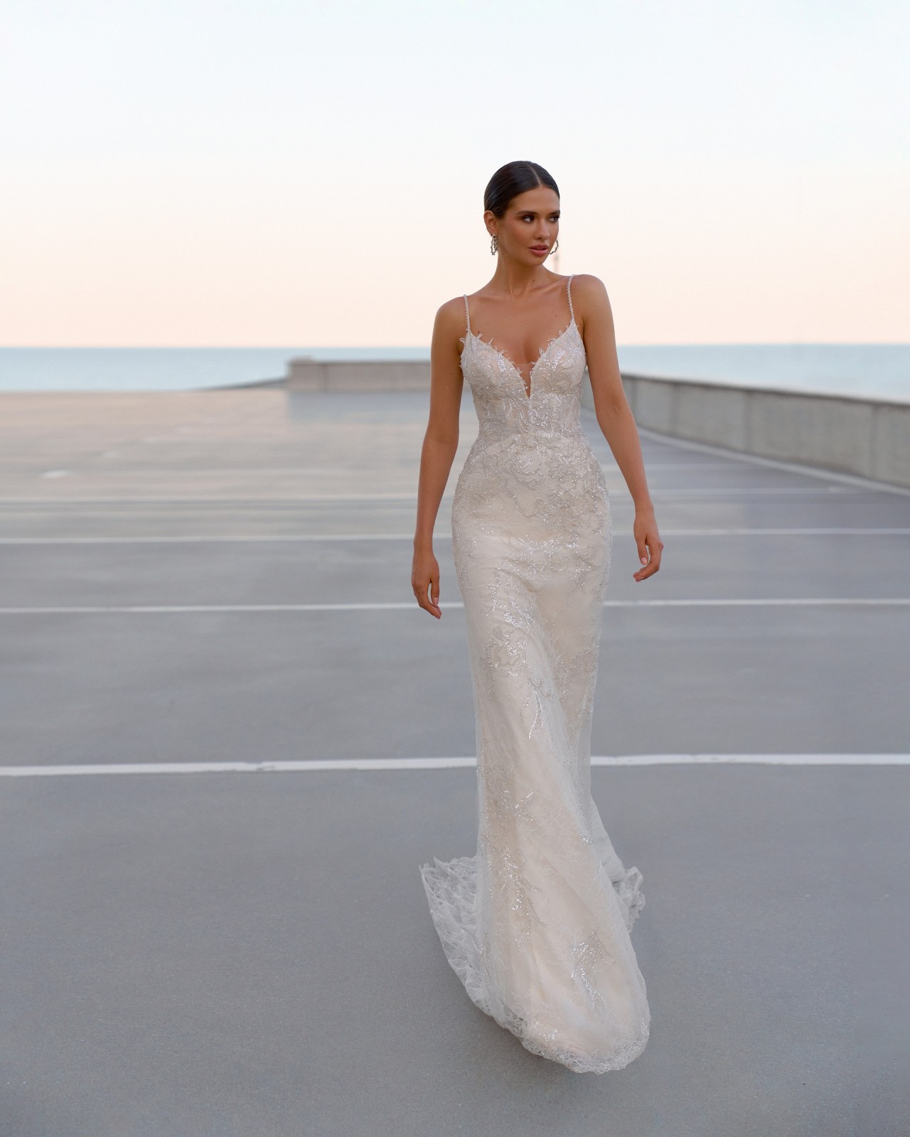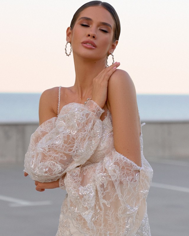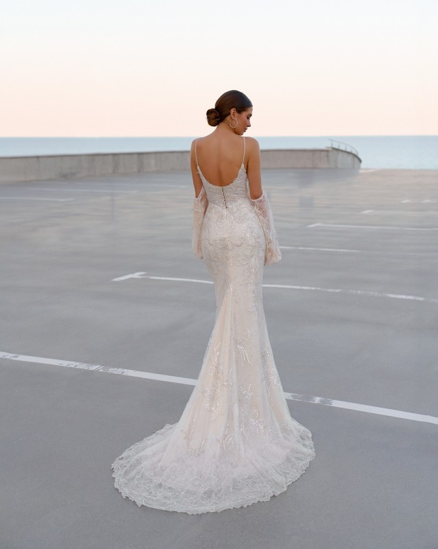 Le haut de la robe de mariée WITNEY présente un magnifique décolleté plongeant en V, délicatement orné de dentelle raffinée et de petites perles scintillantes. Ce détail apporte une touche de féminité et de sophistication, idéale pour un mariage chic et moderne. Les bretelles fines et perlées ajoutent de la légèreté à l’ensemble. De plus, pour les mariées en quête de polyvalence, la robe propose des manches amovibles en dentelle, brodées de motifs floraux et rehaussées de perles, qui permettent de personnaliser le style au gré des envies.