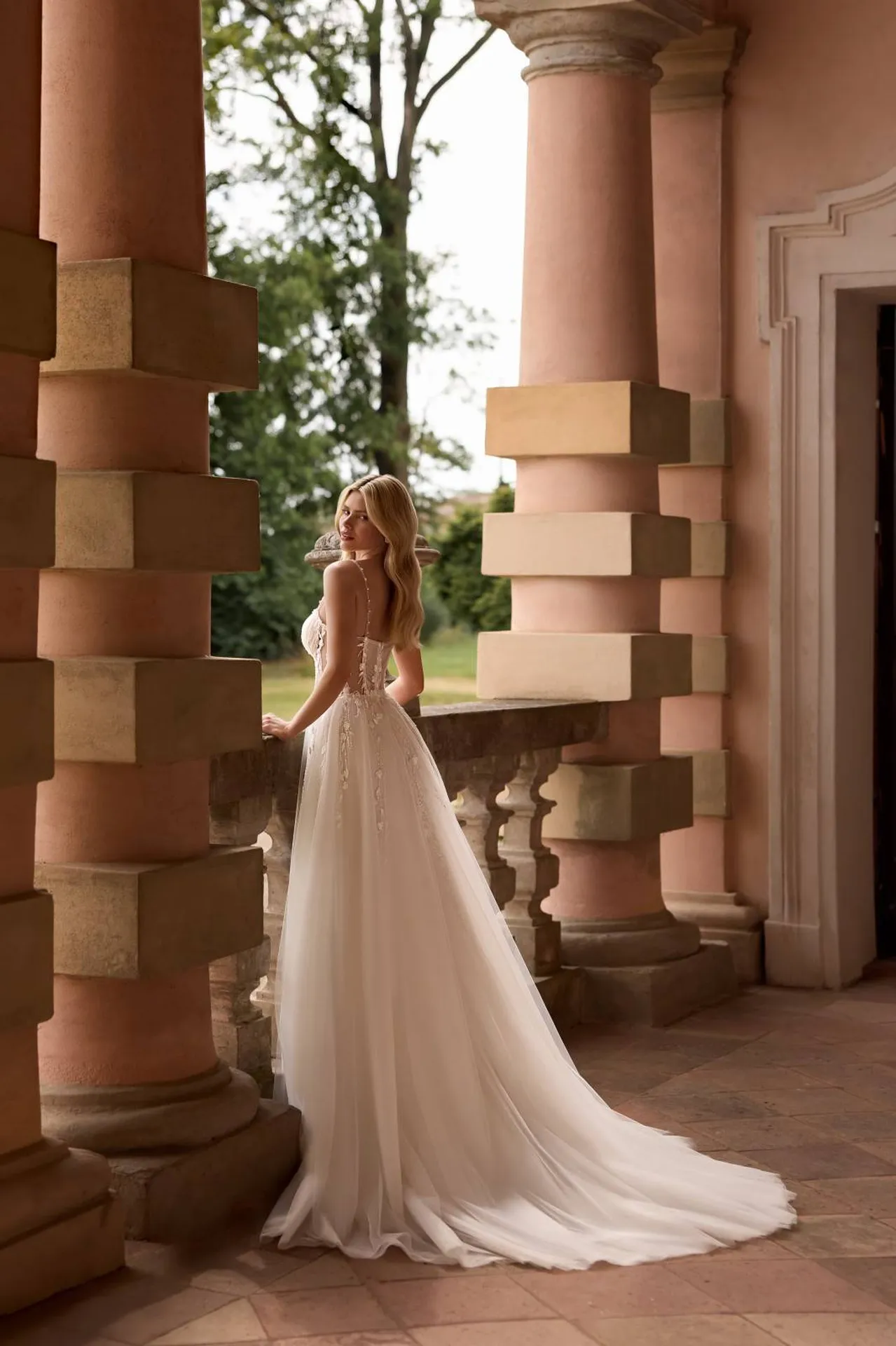 Le bas de la robe se termine par une longue traine merveilleusement spectaculaire .