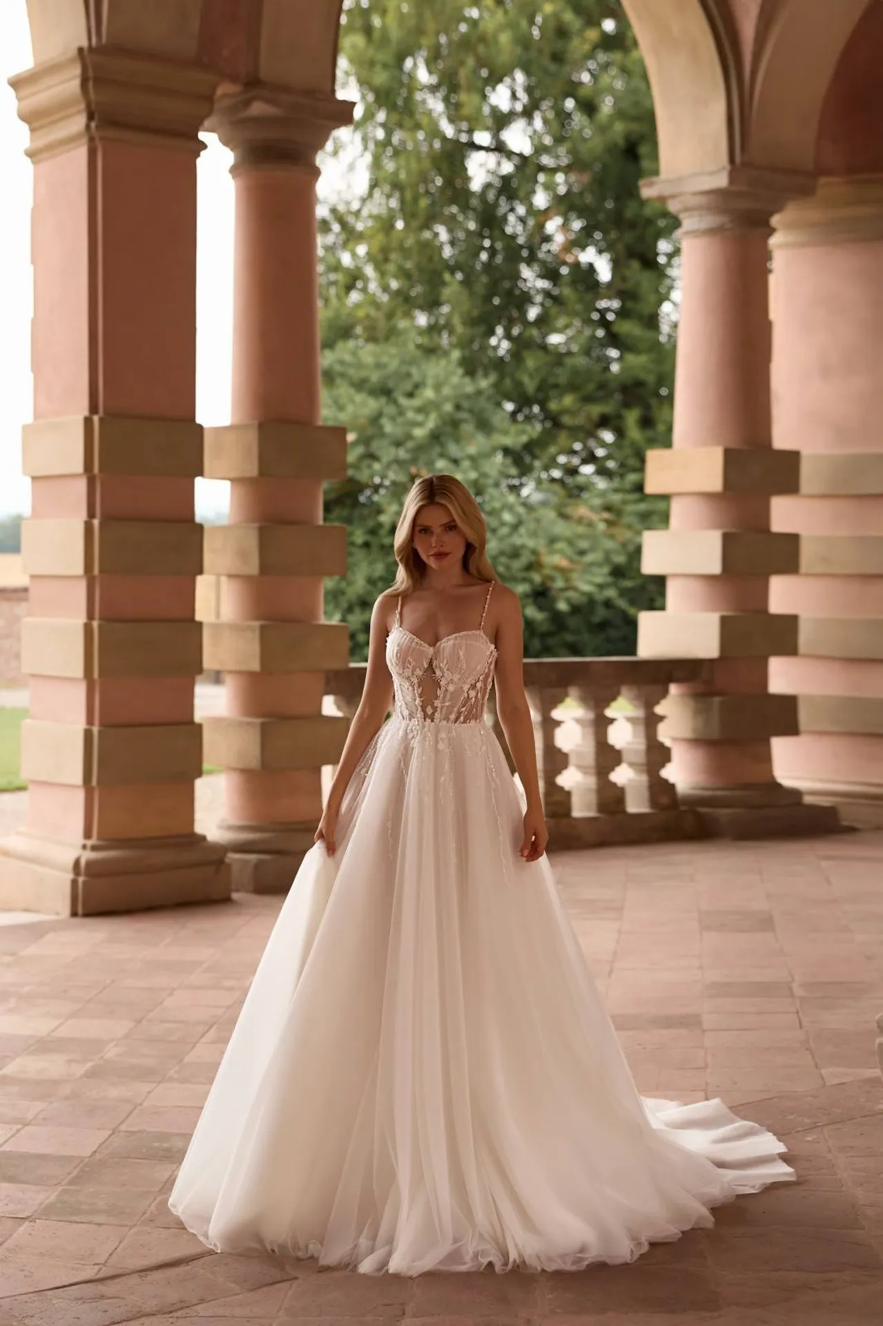 Robe de mariée bustier fines bretelles brodées de pierres , avec baleines apparentes