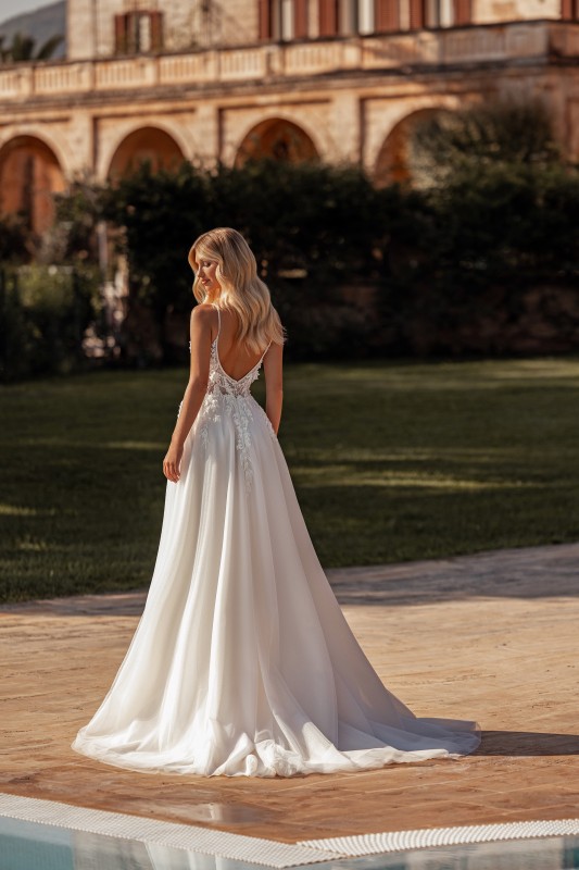 La jupe en tulle fin, fluide et aérienne, se déploie dans une forme trapèze, avec une traîne vaporeuse qui semble flotter autour de la mariée. Cette légèreté rend la robe parfaite pour des mariages en plein air, qu’il s’agisse d’un domaine au milieu des vignes, d’un champ de lavande ou d’un jardin champêtre. Estrella transforme chaque mariée en une princesse des temps modernes, avec une allure inoubliable.