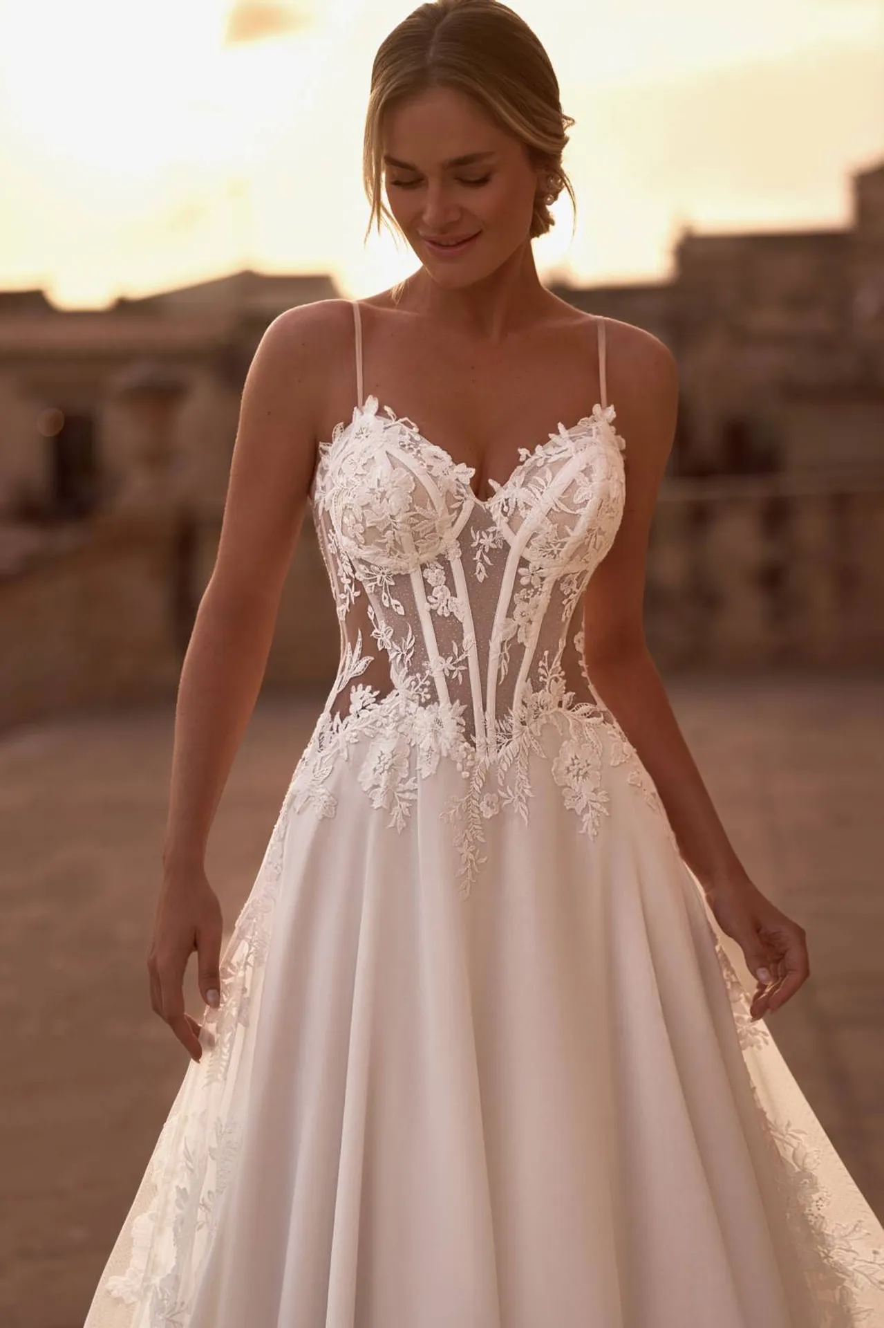 Le buste de la robe de mariée en dentelle est très près du corps avec un beau décolleté en V