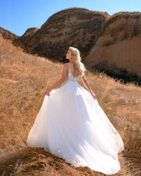La jupe de la robe FLORETH, confectionnée en tulle léger et fluide, est composée de plusieurs couches qui ajoutent du volume tout en conservant un mouvement aérien. Cette silhouette trapèze met en valeur toutes les morphologies, faisant de cette robe un choix polyvalent pour de nombreuses futures mariées.