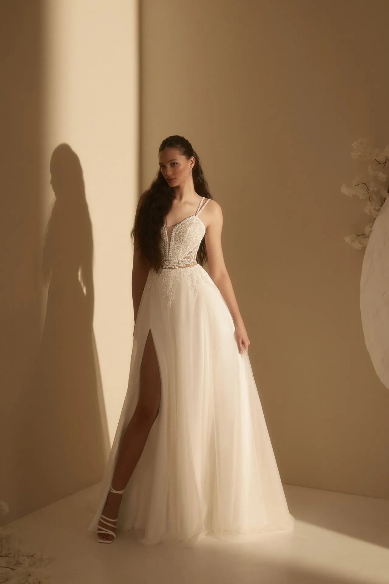 Les bretelles en perles blanches, ornant le haut du buste et le dos, ajoutent une note délicate et précieuse à cette création. Le bas de la robe, évasé et fluide, est réalisé en tulle léger, conférant un mouvement aérien et une élégance naturelle. La fente haute sur la jambe vient parfaire ce modèle, lui insufflant une modernité audacieuse, idéale pour une mariée contemporaine.