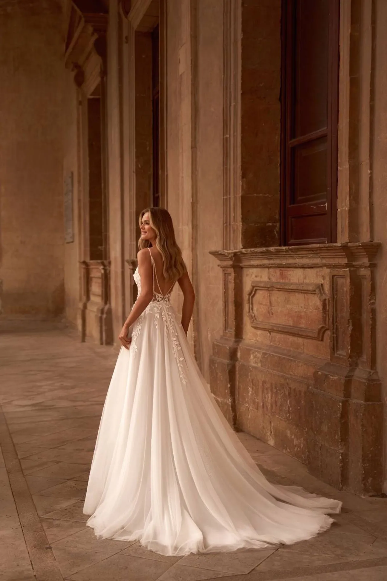 Le bas de la robe de mariée Melissa se compose de plusieurs volumes de tulle , pour lui donner une légère forme princesse en restant fluide et glamour , et d'une longue traîne
