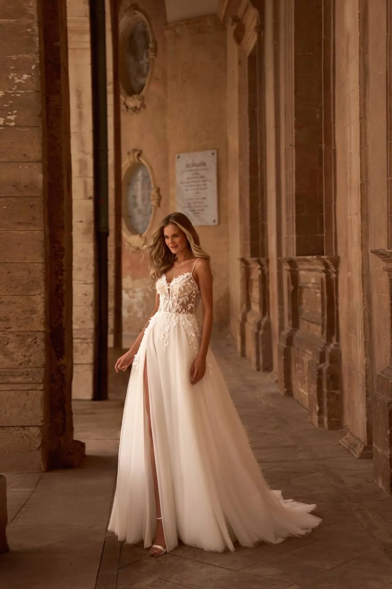 Robe de mariée décolletée en cœur plongeant recouvert d'un tulle couleur peau , d'un buste et d’épaulettes brodées de dentelle