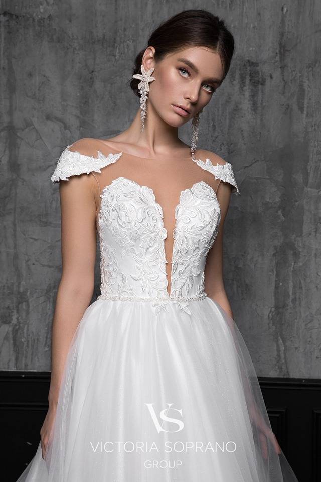 Robe de mariée décolletée en cœur plongeant recouvert d'un tulle couleur peau , d'un buste et d’épaulettes brodées de dentelle