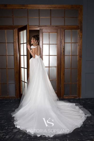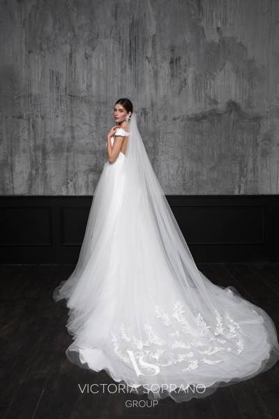 Le bas de la robe de mariée Melissa se compose de plusieurs volumes de tulle , pour lui donner une légère forme princesse en restant fluide et glamour , et d'une longue traîne