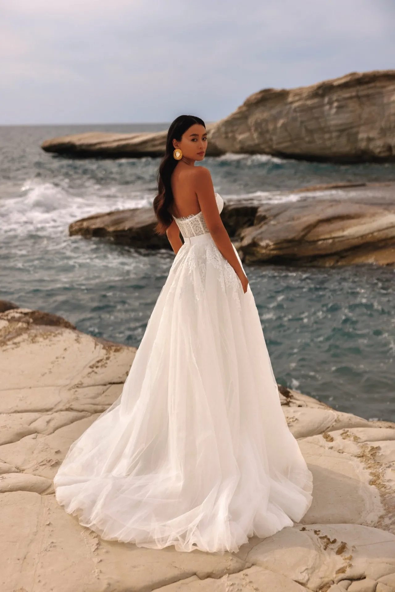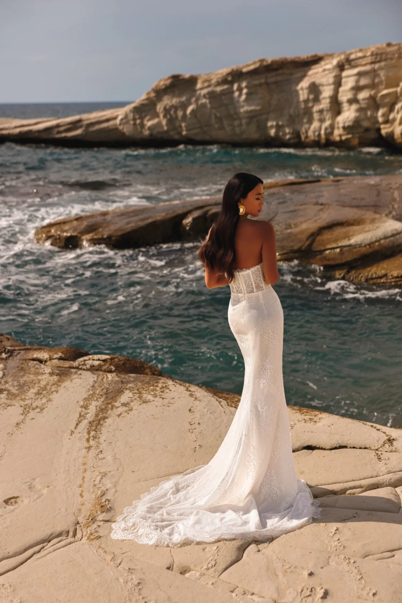 Pour la deuxième partie de votre journée de mariage, vous pouvez retirer la jupe traîne, révélant une robe sirène bustier glamour et raffinée. Ce style vous permet de passer d’une allure princesse à une allure plus sensuelle en un instant, idéal pour un changement de look entre la cérémonie et la réception.