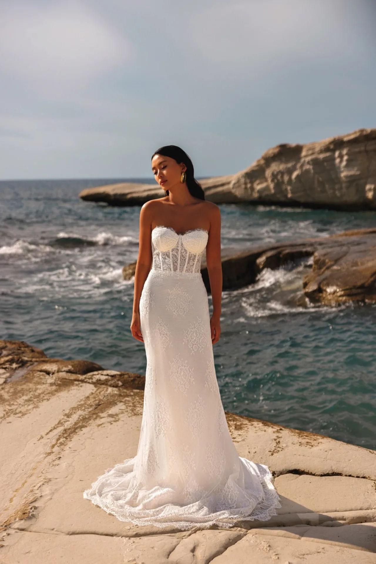 Le bustier, entièrement baleiné et réalisé en fine dentelle, s’ajuste parfaitement à votre poitrine. Inspiré du corset de lingerie, il confère un maintien impeccable tout en ajoutant une touche romantique. Cette dentelle délicate, appliquée avec soin sur toute la robe, dessine vos courbes avec subtilité, mettant en valeur votre féminité et créant une silhouette sirène élégante et sensuelle.