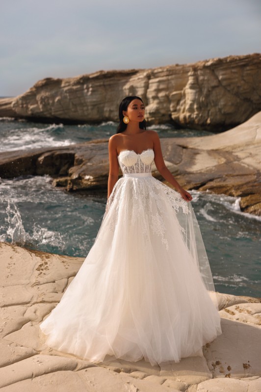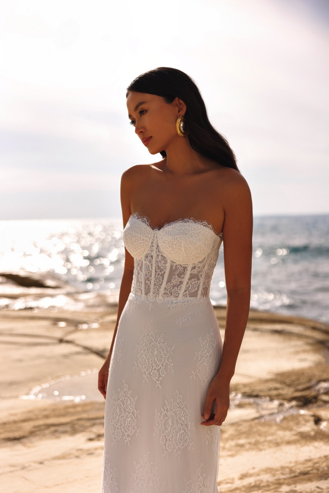 Le bustier, entièrement baleiné et réalisé en fine dentelle, s’ajuste parfaitement à votre poitrine. Inspiré du corset de lingerie, il confère un maintien impeccable tout en ajoutant une touche romantique. Cette dentelle délicate, appliquée avec soin sur toute la robe, dessine vos courbes avec subtilité, mettant en valeur votre féminité et créant une silhouette sirène élégante et sensuelle.