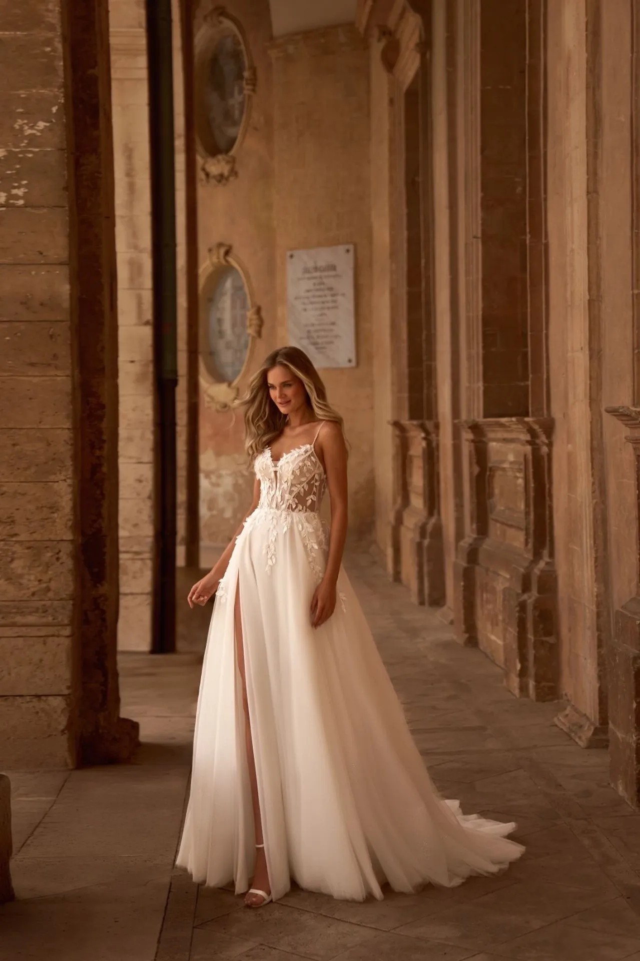 Vous êtes à la recherche de la robe de mariée idéale pour un mariage bohème chic ? Une robe de mariée fluide en tulle scintillant, avec une fente sur la jambe, un haut en dentelle perlée aux motifs de feuilles, un bustier de lingerie décolleté V et un d...