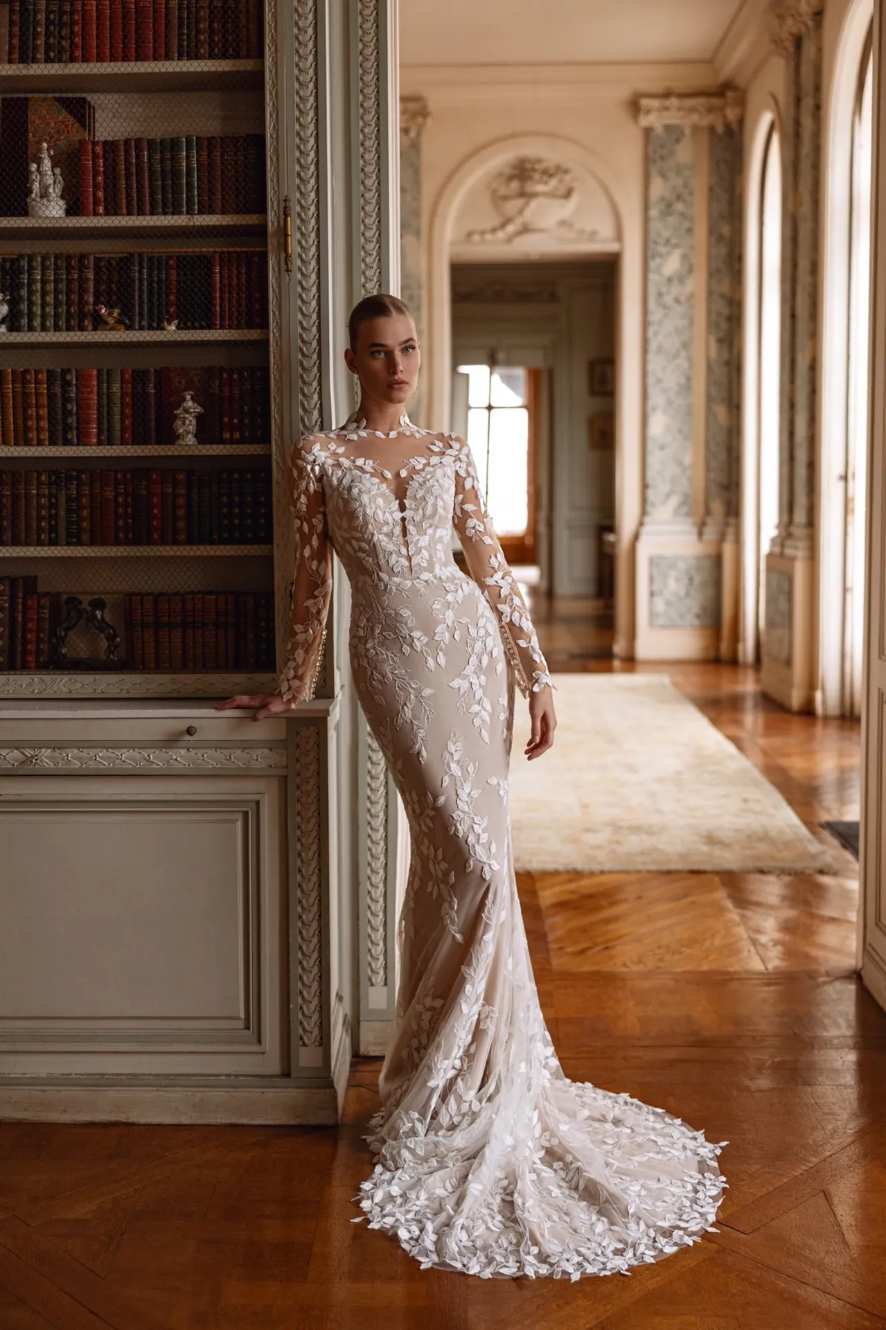 robe de mariée à marseille de créateur ATELIER MARIE CLAIRE modèle GENOVA nouvelle collection robe de mariée 2019 robe de mariée longue avec manche longue bas volanté , décolleté en V plongeant et ceinture brodé de perles forme sirène dos nu en goutte ...
