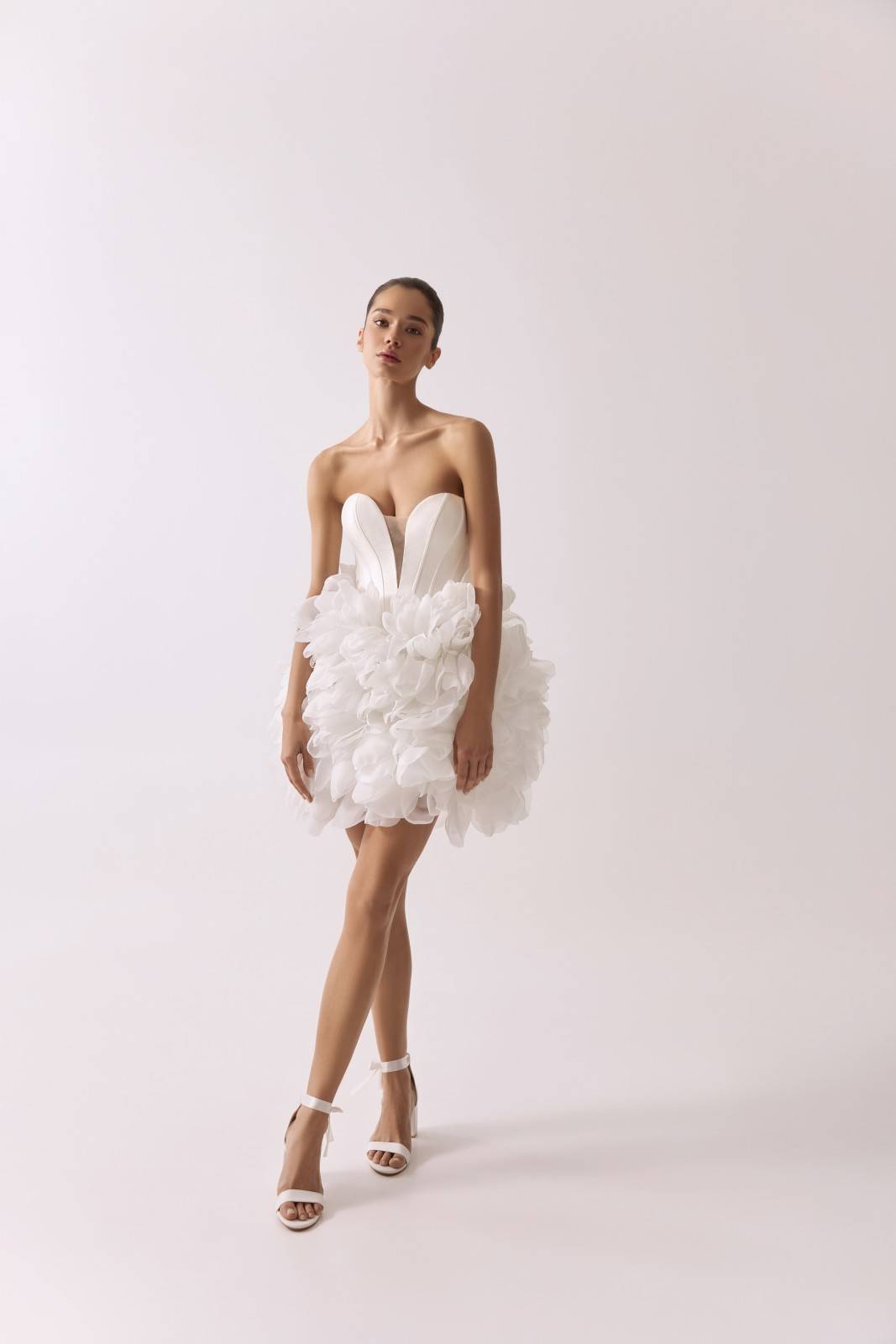 Robe courte, avec un dos-nu, sans manches, agrémentée de cristaux, brodée de dentelle, une robe de mariée glamour, chic et moderne pour le mariage civil !